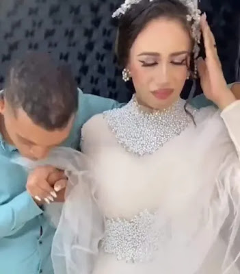 وفي الفيديو، اقترب العريس من العروس محاولًا تقبيل يدها، لكنها أبعدته بسرعة؛ ما أثار التكهنات حول كونها مجبرة على الزواج منه.